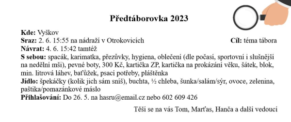 Téměř všichni účastníci tábora by měli najít ve svých schránkách poslední informace před táborem. Pokud by se k někomu nedostal, ... pokračovat ve čtení