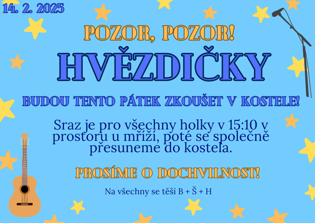 Naše milé Hvězdičky, tento pátek 14. 2. budeme mít zkoušku v kostele! Přijďte prosím včas, ať vše hezky stihneme. Sraz ... pokračovat ve čtení