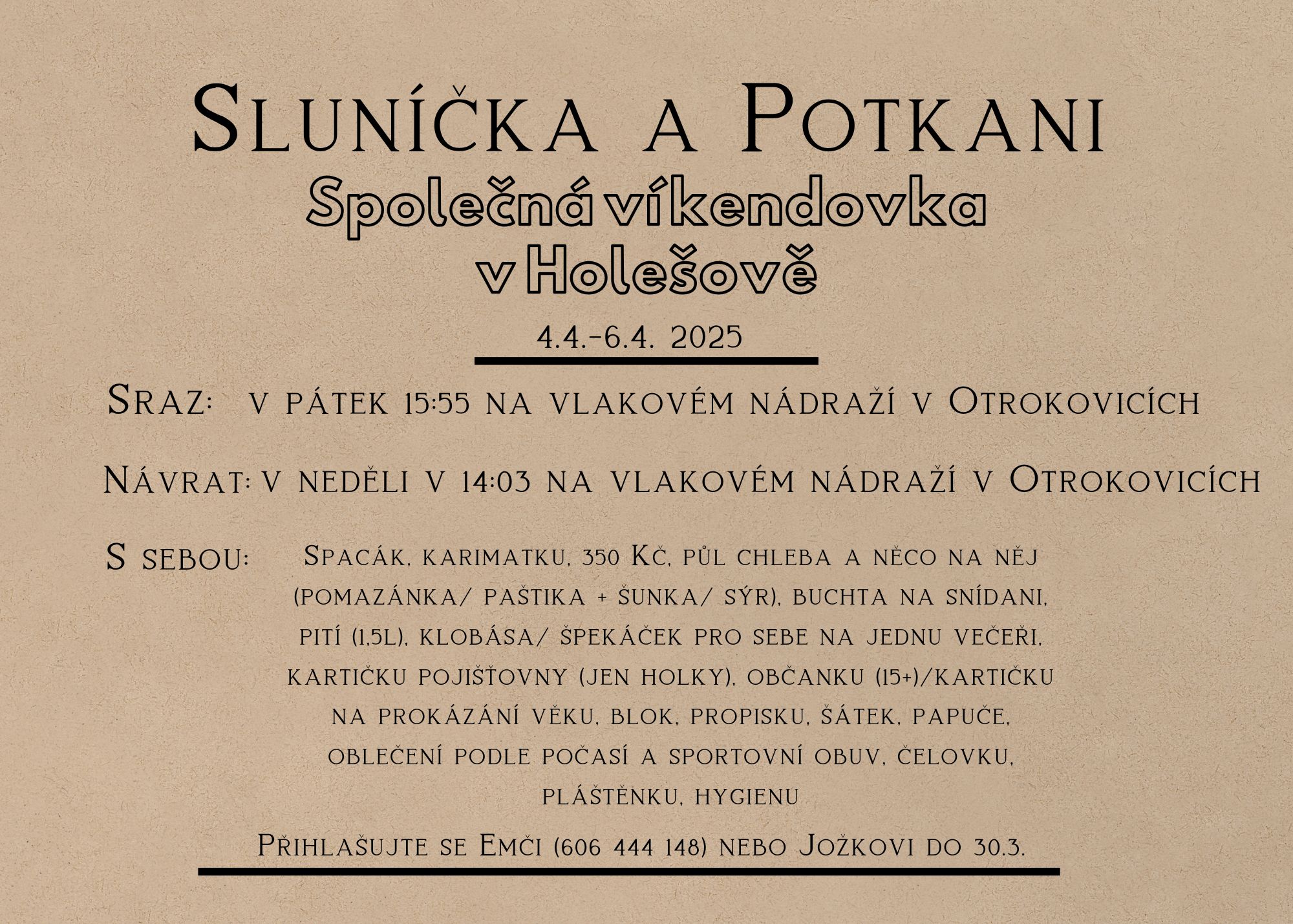 Společná víkendovka Sluníček a Potkanů bude i letos! Takže si zapiš termín do kalendáře a přihlaš se teď hned Jožkovi nebo Emči! ... pokračovat ve čtení