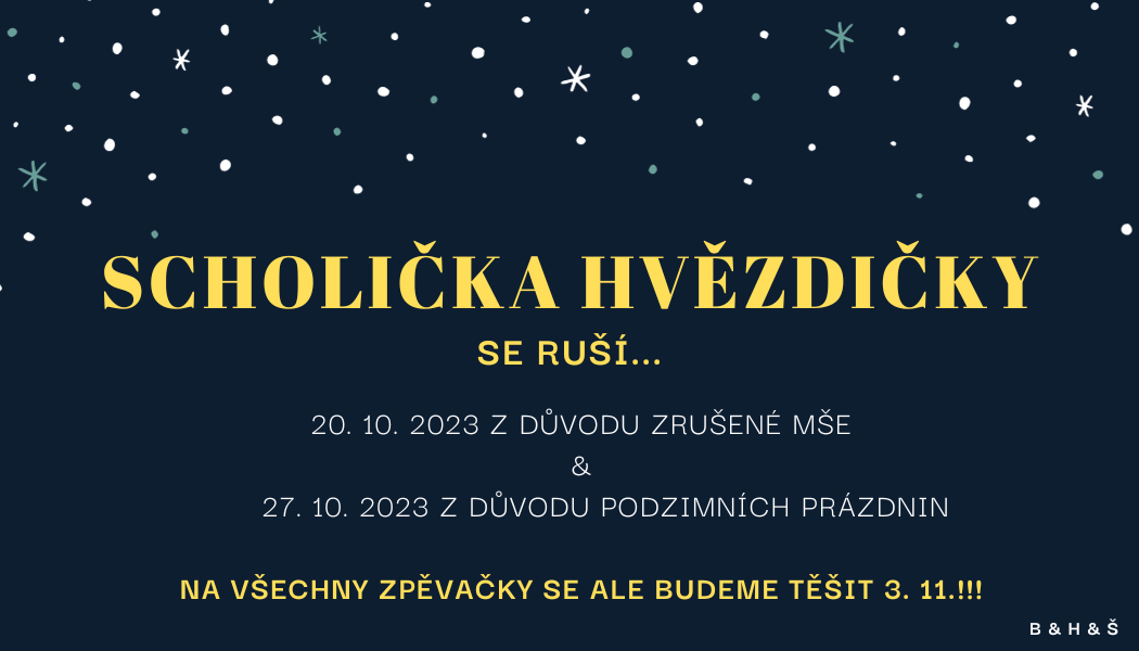 Všem zpěvačkám, našim hvězdičkám oznamujeme, že v pátek 20.10. ani v pátek 27.10. scholička nebude.Proč? - 20.10. není mše- 27.10. ... pokračovat ve čtení