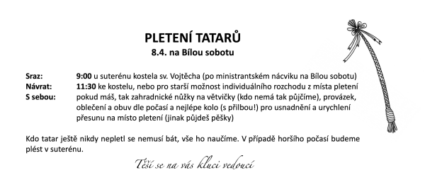 V sobotu 8.4. tradičně všichni kluci vyrazíme plést tatary. Kdo můžete přijeďte na kole ať nemusíte šlapat pěšky. :-) ... pokračovat ve čtení