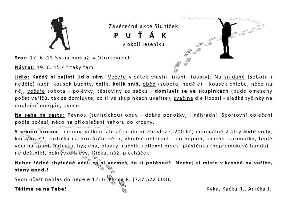 Konec školního roku už se blíží a s ním i peckovní závěrečná akce Sluníček. Bude to stát za to a prochodíme krásy Jeseníků! :-) ... pokračovat ve čtení