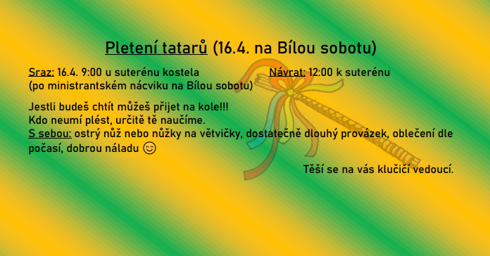 Máme tu po roce Velikonoční svátky a k tomu se pojí i ministrování s nácviky. Pamatuj! Pokud na nácvik nepřijdeš, nebudeš moct na mši ministrovat! ... pokračovat ve čtení