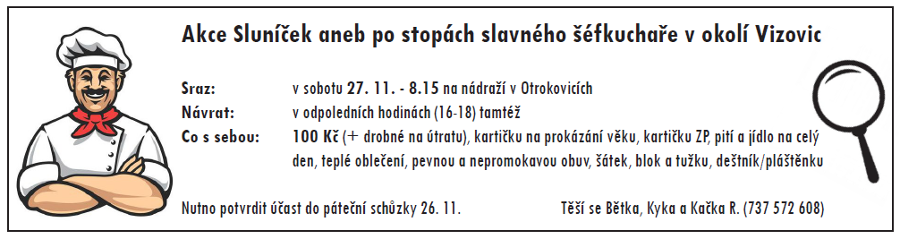 Z důvodu extra malého počtu holek se dnešní schůzka (26. 11.) Sluníček ruší. Zároveň přesouváme i sobotní akci. O novém ... pokračovat ve čtení