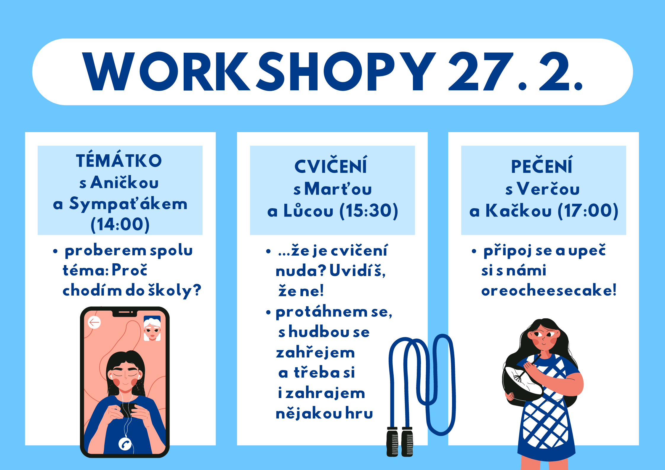 Máme pro vás novinku! V sobotu 20. a 27. budou probíhat tzv. online miniworkshopy s různým zaměřením. První sobotu budou ... pokračovat ve čtení